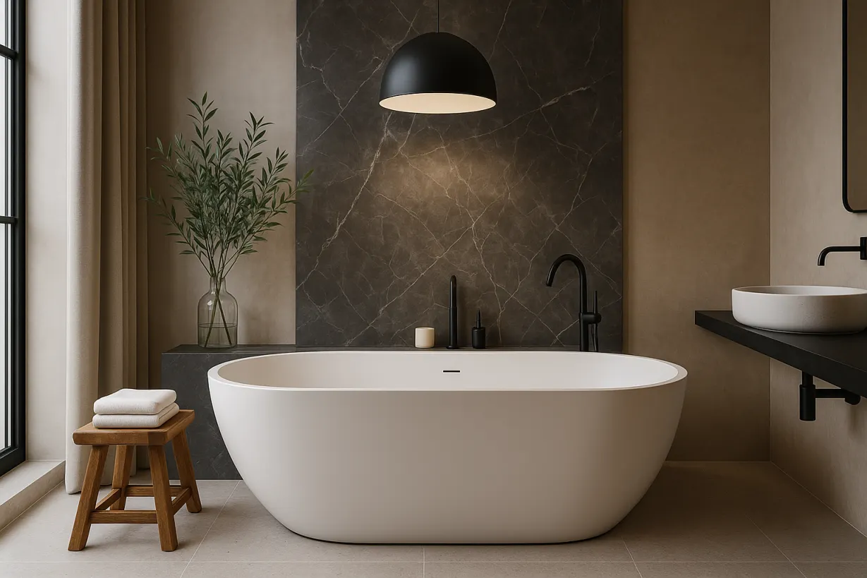 - Эстетика. Ванна должна гармонично вписываться в интерьер. Например, угловые модели подходят для небольших помещений, а отдельно стоящие ванны требуют больше пространства.