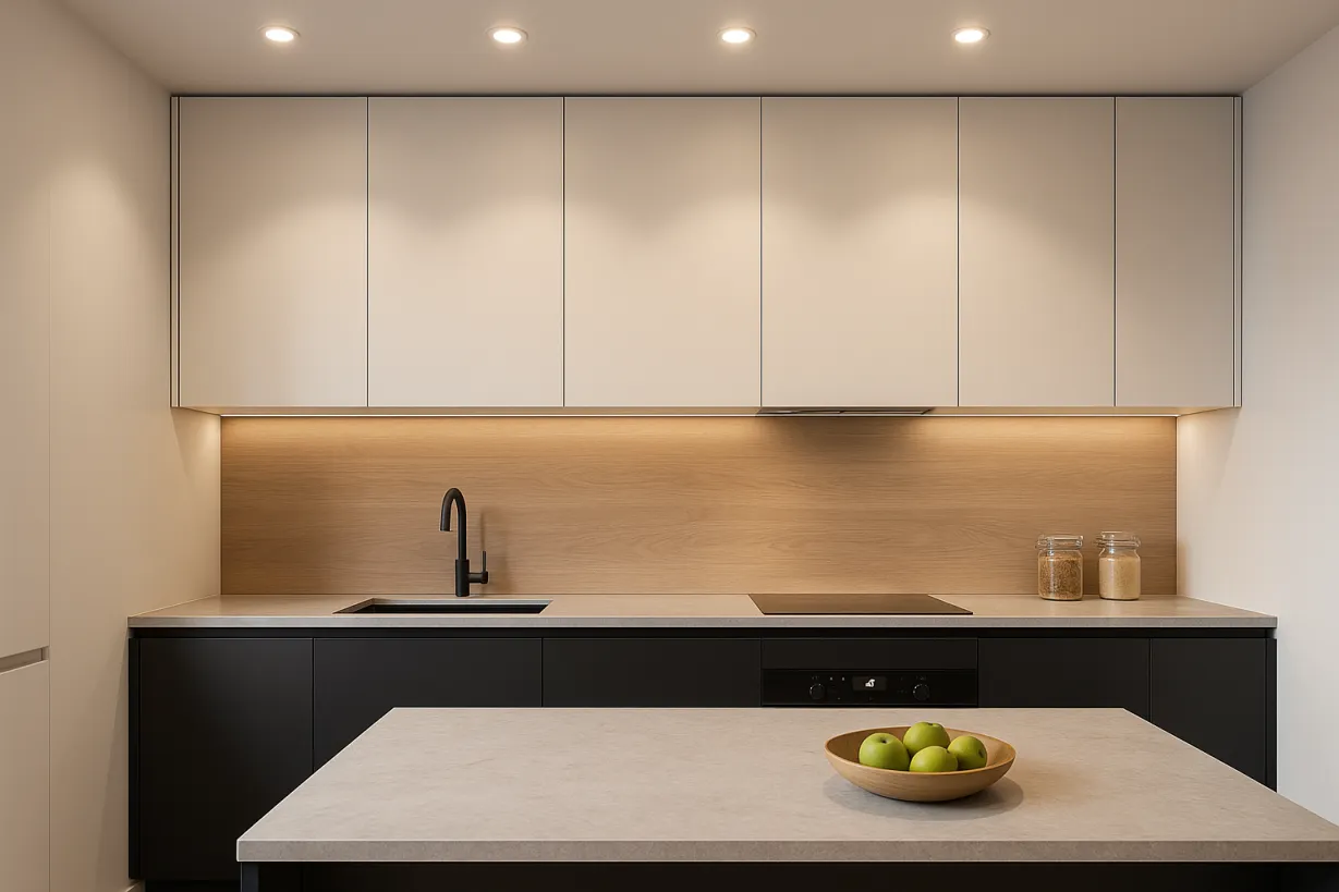 - Кухня: 300–500 лк. Яркое освещение для рабочей зоны (столешница, плита) и мягкое для обеденной.