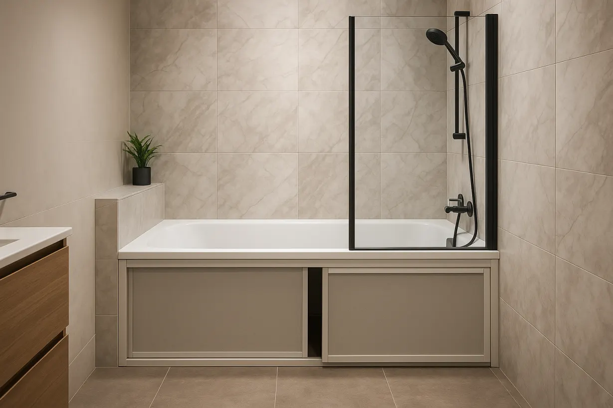 Раздвижной экран под ванну — это универсальное решение, которое сочетает в себе практичность и эстетику. Он скрывает трубы, сифон и другие элементы коммуникаций, которые могут портить внешний вид ванной комнаты. Благодаря раздвижному механизму вы получаете удобный доступ к этим элементам для ремонта, замены или уборки, не разбирая конструкцию. Экран также помогает организовать пространство, позволяя хранить под ванной моющие средства, инструменты или другие предметы.