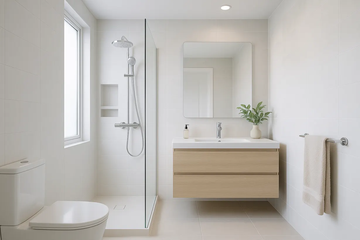 - Потолок: Натяжные потолки из ПВХ или реечные алюминиевые конструкции устойчивы к влаге и предотвращают скопление конденсата.