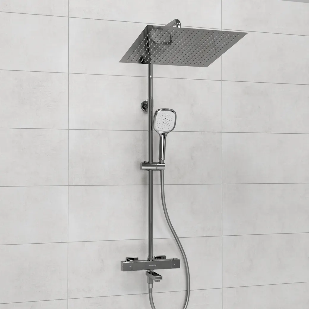 - Надёжность и безопасность: благодаря термостатическому смесителю, данный душевой комплект поддерживает стабильную температуру воды, предотвращая ожоги.