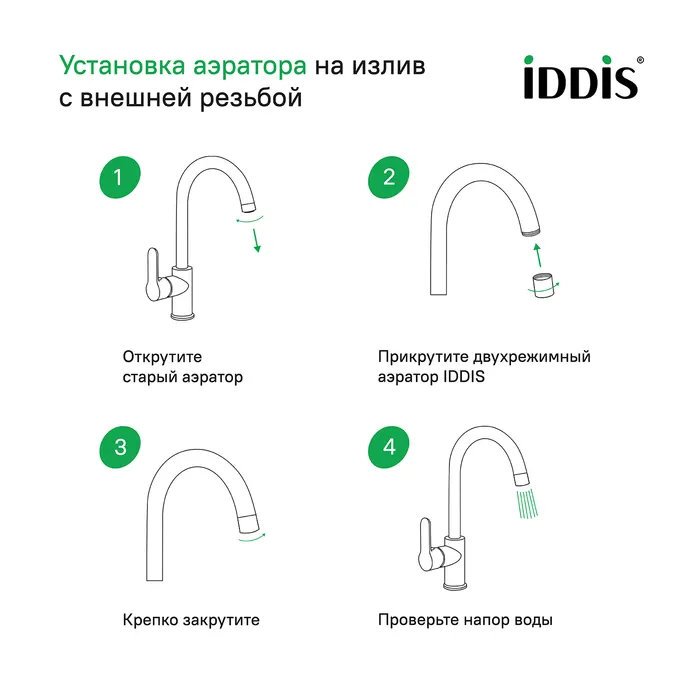 Корпусный пластиковый аэратор IDDIS® с внутренней резьбой имеет два режима – обычная аэрированная струя и душевая. Режимы переключаются поворотом аэратора. В комплекте переходник на резьбу М24.
