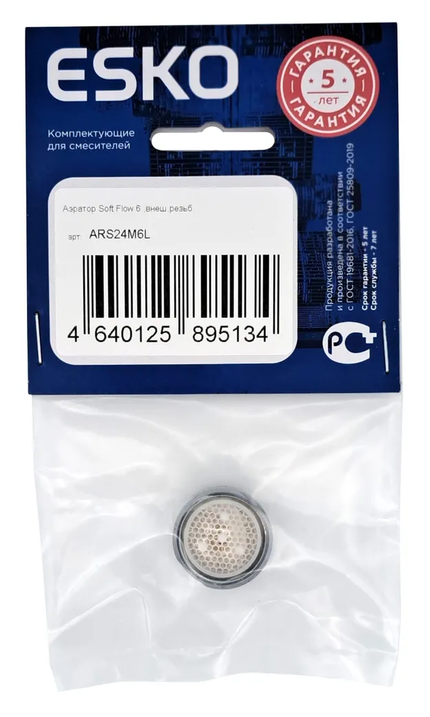 Аэратор Soft Flow 6, внеш. резьба М24, нерж. сталь, макс. расход воды 6 л/мин, ESKO