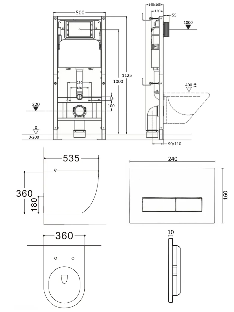 Подвесной безободковый унитаз с инсталляцией и кнопкой смыва от немецкого бренда Agger - функциональное и эргономичное решение. Материал унитаза санфарфор отличается беспористой структурой, высокой прочностью и стойкостью к появлению пятен, что позволит сохранить первоначальный вид изделия на долгие годы использования, гарантия от производителя 25 лет. Обтекаемая форма корпуса не позволяет скапливаться пыли. Мощный каскадный смыв - подарит комфорт при эксплуатации. Безободковая модель - отсутствие недоступных областей для уборки обеспечит простой уход и отсутствие посторонних запахов. В комплекте быстросъемная крышка-сиденье с функцией плавного закрывания Soft-close, сиденье изготовлено из прочного материала - дюропласта, петли крышки-сиденья из нержавеющей стали. Скрытая система монтажа, цвет матовый черный. Инсталляция обеспечит минимальный уровень шума и максимальный уровень комфорта при эксплуатации. В комплект входят все необходимые крепления. Максимально допустимая нагрузка 400 кг. Объем смыва 3 и 6 литра позволяет экономить воду, снижая ее расход. Ширина рамы - 500 мм, глубина - 145/165 мм, высота - 1125/1325 мм. Материал - сталь. Кнопка смыва с механическим управлением отличается современным дизайном и гармонично дополнит интерьер. Выполнена в цвете глянцевый белый. Форма кнопок - прямоугольная, материал - пластик. Гарантия: 25 лет - унитаз, 10 лет - инсталляция, 2 года - кнопка смыва.