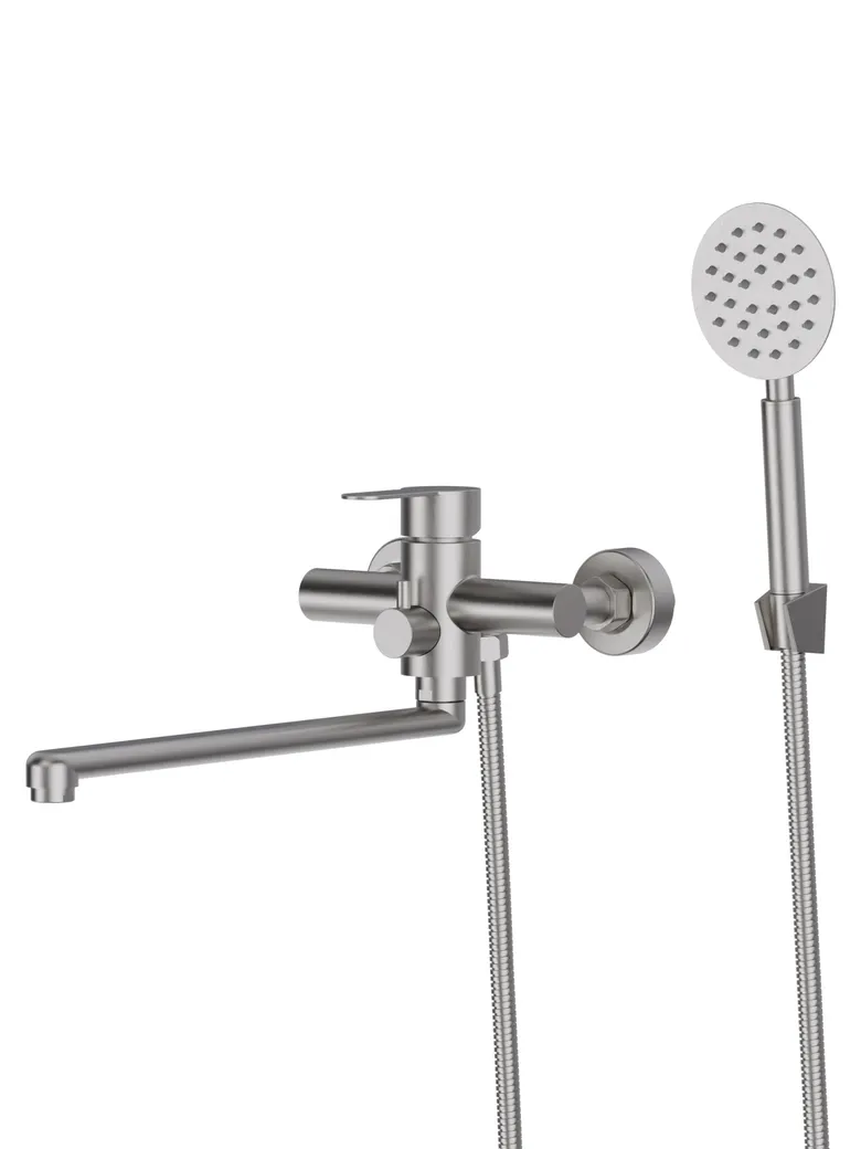 Однозахватный смеситель для ванны/душа с универсальным изливом и душевым набором Agger Zest гармонично дополнит и украсит интерьер Вашей ванной комнаты. Корпус выполнен из нержавеющей стали, не подверженной коррозии от длительного контакта с водой. Фирменный картридж Agger делает легким управление напором и температурой воды, а керамический поворотный дивертор переключит ее направление с излива на душ даже при низком давлении. Износостойкое покрытие в цвете матовый никель нанесено по технологии вакуумного напыления (PVD), на нем незаметны разводы от высохшей воды и отпечатки пальцев. Аэратор экономит воду и, обогащая струю воздухом, делает её мягкой и без брызг. В комплекте душевой набор: ручная лейка d97 мм (1 режим), душевой шланг 1500 мм в металлической оплетке (с защитой от перекручивания) и настенный держатель лейки.
