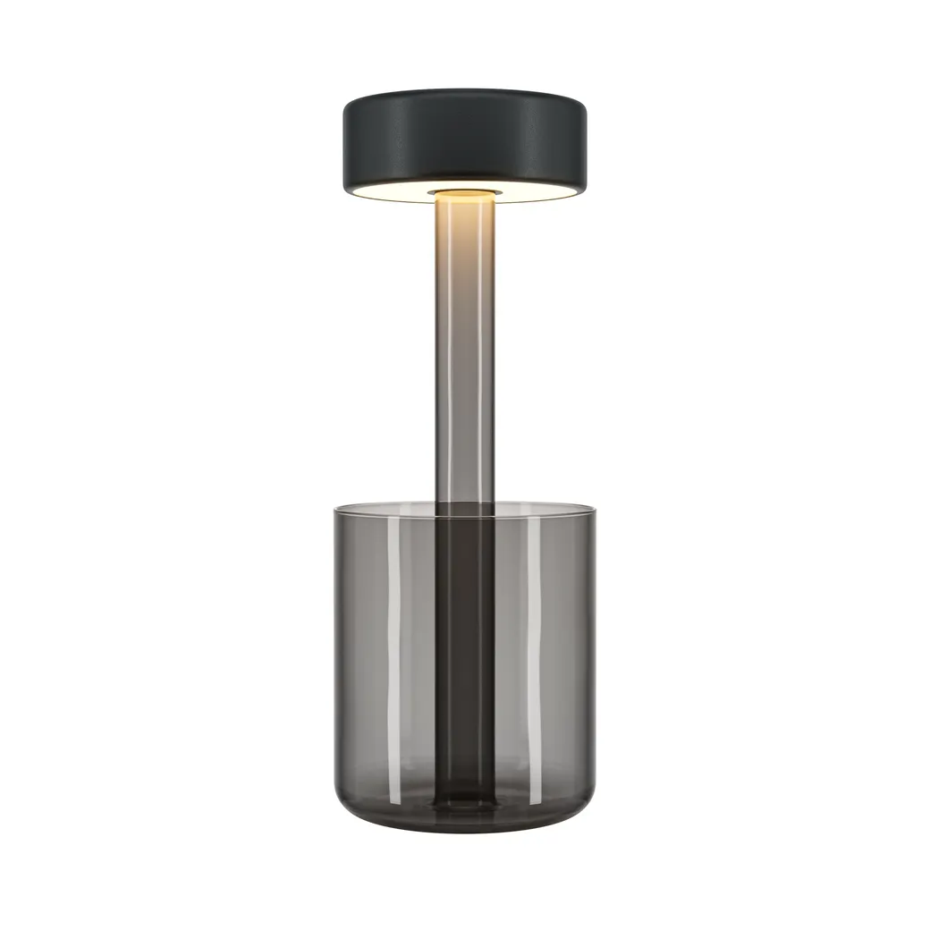 Портативный настольный светильник. Результат творческой коллаборации искусственного интелекта и предметного дизайнера. Два варанта корпуса светильника: с металлической тонкой ножкой на плоском круглом основании; со стеклянным основанием с интегрированным в него вазой. Плафон снимается с основания для удобного ухода за стеклянными элементами и подзарядки аккумулятора, расположенного в плафоне. Два варианта цвета стеклянных моделей - прозрачный и серый. Плафоны с рассеивателем из акрила в 3х цветах: черный, золотой, белый. Удобный сенсорный выключатель вверху плафона. Micro USB разъем для подзарядки скрыт в нижней части плафона. LED-источник света. Регулируемая цветовая температура от 2200К до 4000К.