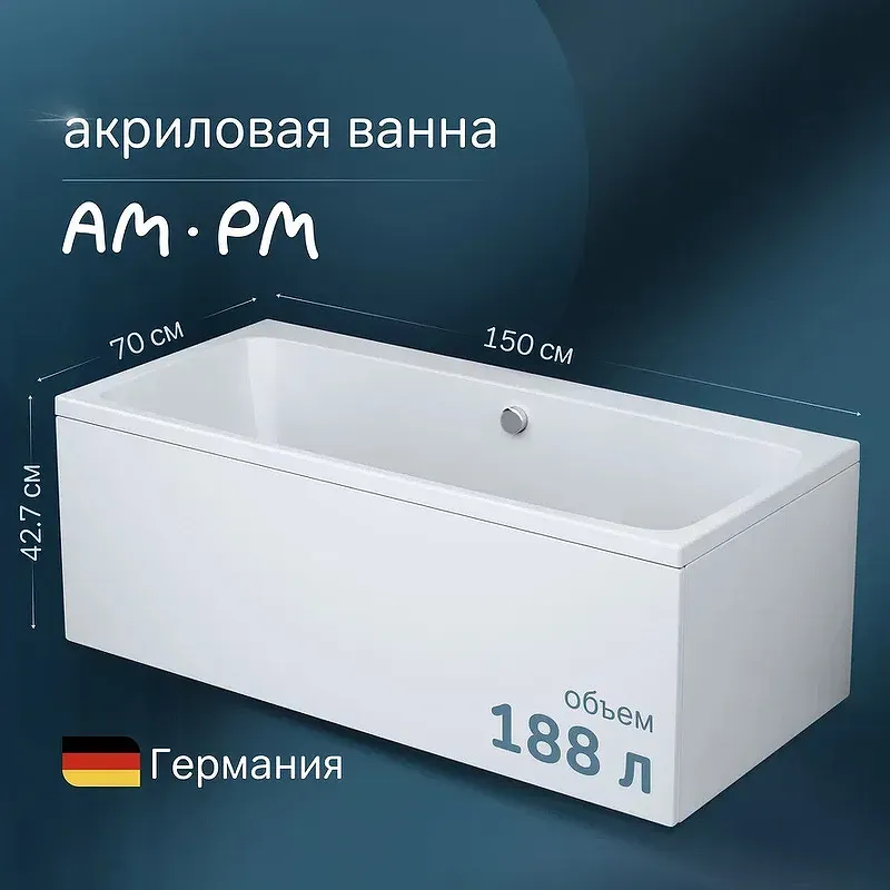 - Качественные материалы: Прямоугольная акриловая ванна AM.PM отличается прочностью и стильным внешним видом.