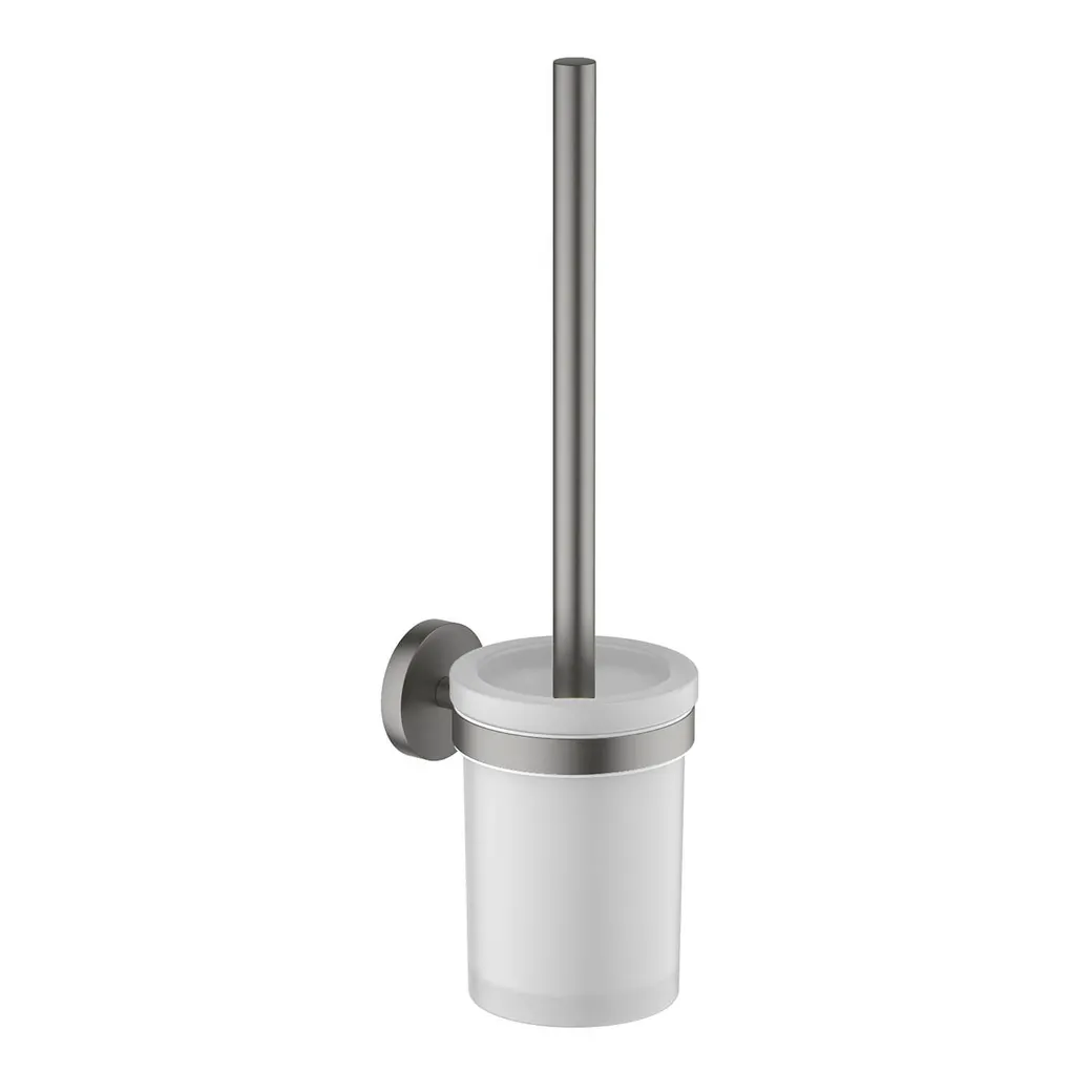 Материал - латунь Стакан из матового стекла Головка ершика из пластика, цвет черный Держатель из нержавейки Упаковано в белую коробку Размеры: 94*119*357мм