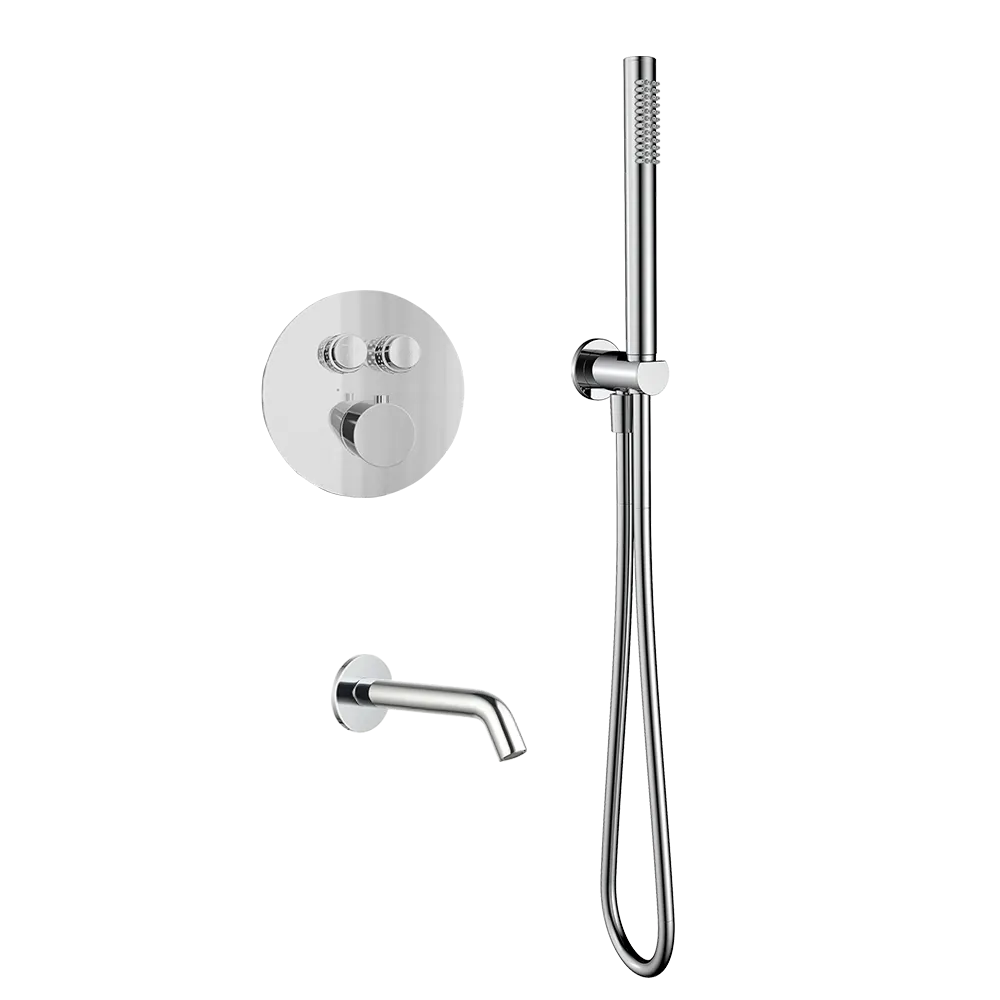 Комплектация: встраиваемый смеситель с термостатом, излив, ручной душ с шлангом и соединителем