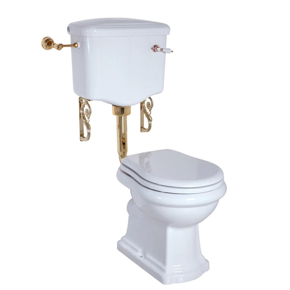 BELLA Комплект унитаз напольный выпуск в стену, бачок низкий с ручкой золото, белый (БЕЗ КРЫШКИ) арт-31113