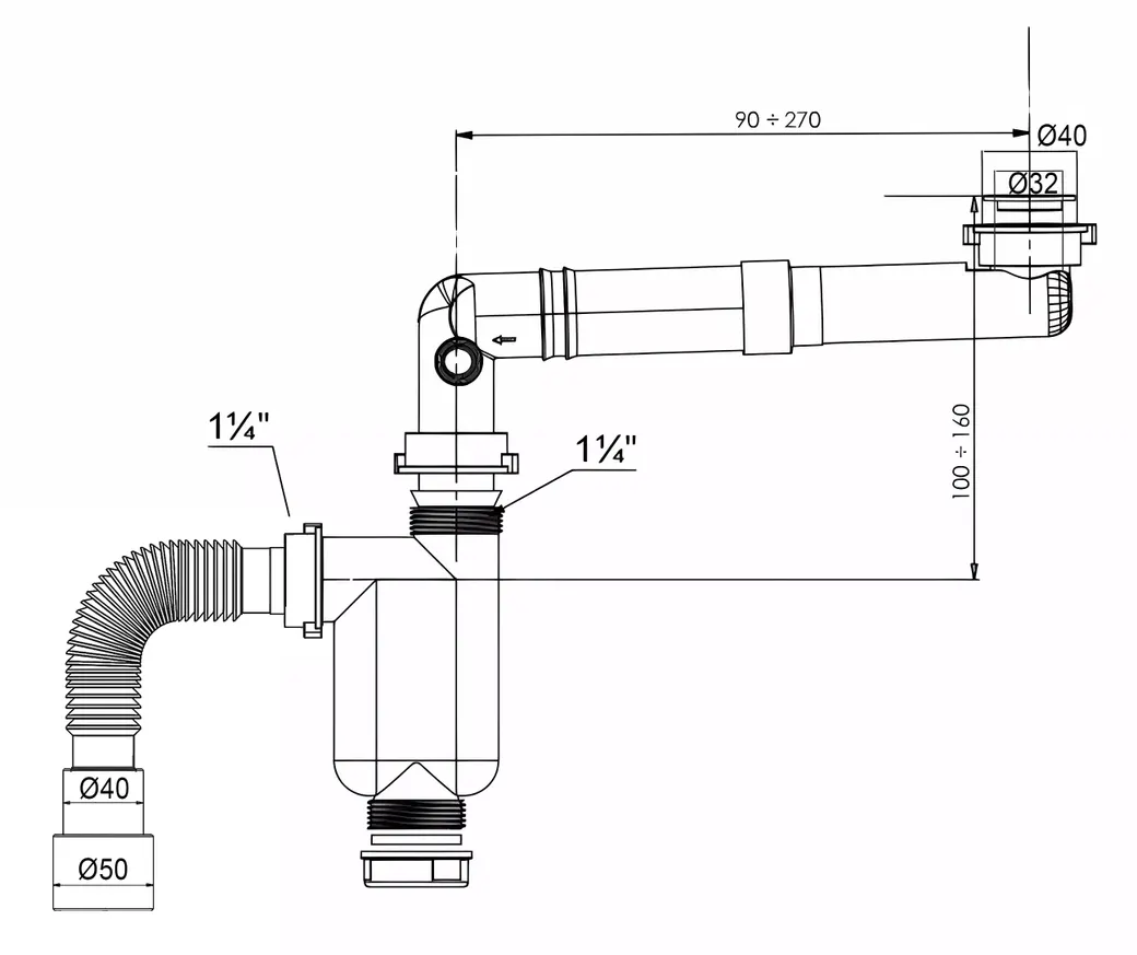 Компактный сифон для раковины с телескопической регулировкой BETTOSERB Идеальное решение для ограниченного пространстваСпециально разработан для экономии места под мойкой. Благодаря телескопической конструкции с регулировкой длины от 90 до 270 мм легко адаптируется к любой конфигурации сантехнического подключения.Ключевые особенности:? Телескопическая горизонтальная регулировка (90-270 мм) — идеальная посадка в любом пространстве? Универсальный выпуск — подключение стиральной или посудомоечной машины? Совместимость — работает с донным клапаном/выпуском диаметром 32 мм? Бутылочный тип — надежный гидрозатвор и удобство обслуживания? Гибкое подключение — гофрированное соединение 40/50 мм для легкого монтажаТехнические параметры:? Диаметр слива: 32 мм? Тип сифона: бутылочный? Подключение к канализации: 40/50 мм (гофрированное соединение)? Регулируемая длина: 90-270 ммПреимущества:? Максимальная экономия пространства под мойкой? Удобная регулировка без дополнительных инструментов? Надежная защита от запахов (гидрозатвор)? Упрощенное подключение бытовой техники? Устойчивость к коррозии и долгий срок службыКомплектация:Основной корпус бутылочного сифонаТелескопическая регулируемая трубаОтвод для подключения бытовой техникиГофрированное соединение для канализацииВсе необходимые крепежные элементыИдеальный выбор для современных кухонь и ванных комнат с ограниченным пространством! Обеспечивает удобство монтажа, надежную работу и длительную эксплуатацию без протечек.