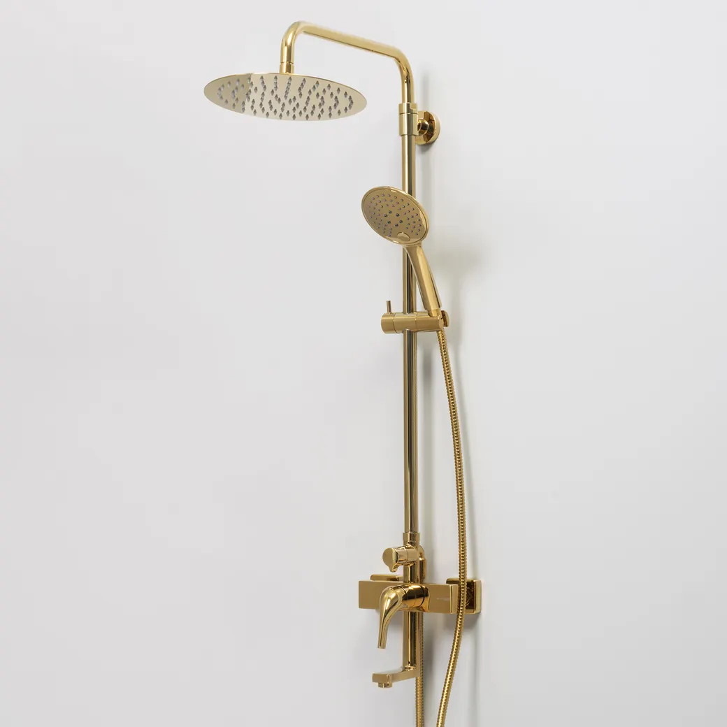 - Элегантный дизайн: Золотой цвет и круглая форма делают данный душевой комплект настоящим украшением вашей ванной комнаты.