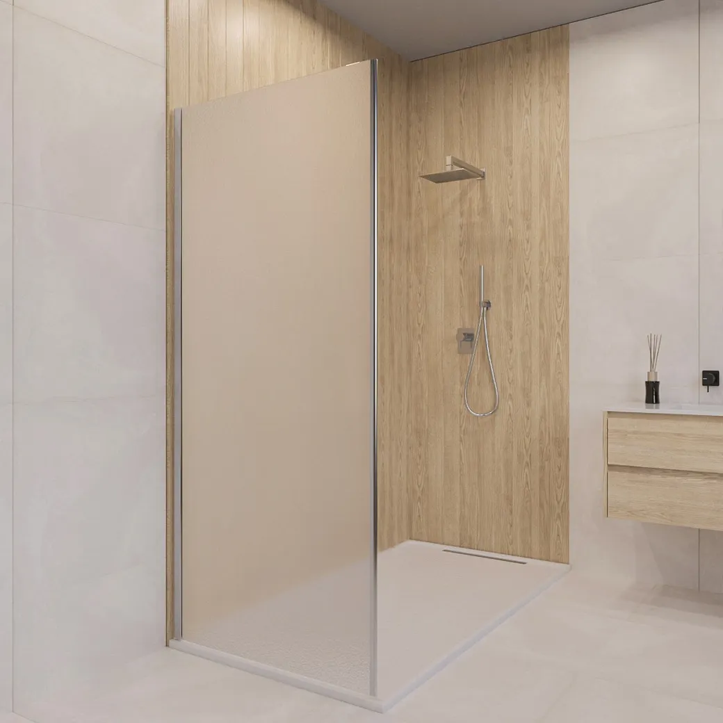 Боковая панель с пристенным профилем, оснащена высокопрочным закалённым стеклом толщиной 6 мм и усиленным профилем для соединения в конфигурацию П-образного или Г-образного угла с душевыми дверьми RGW CL-13, которые имеют цвет профиля и стекло в аналогичном исполнении