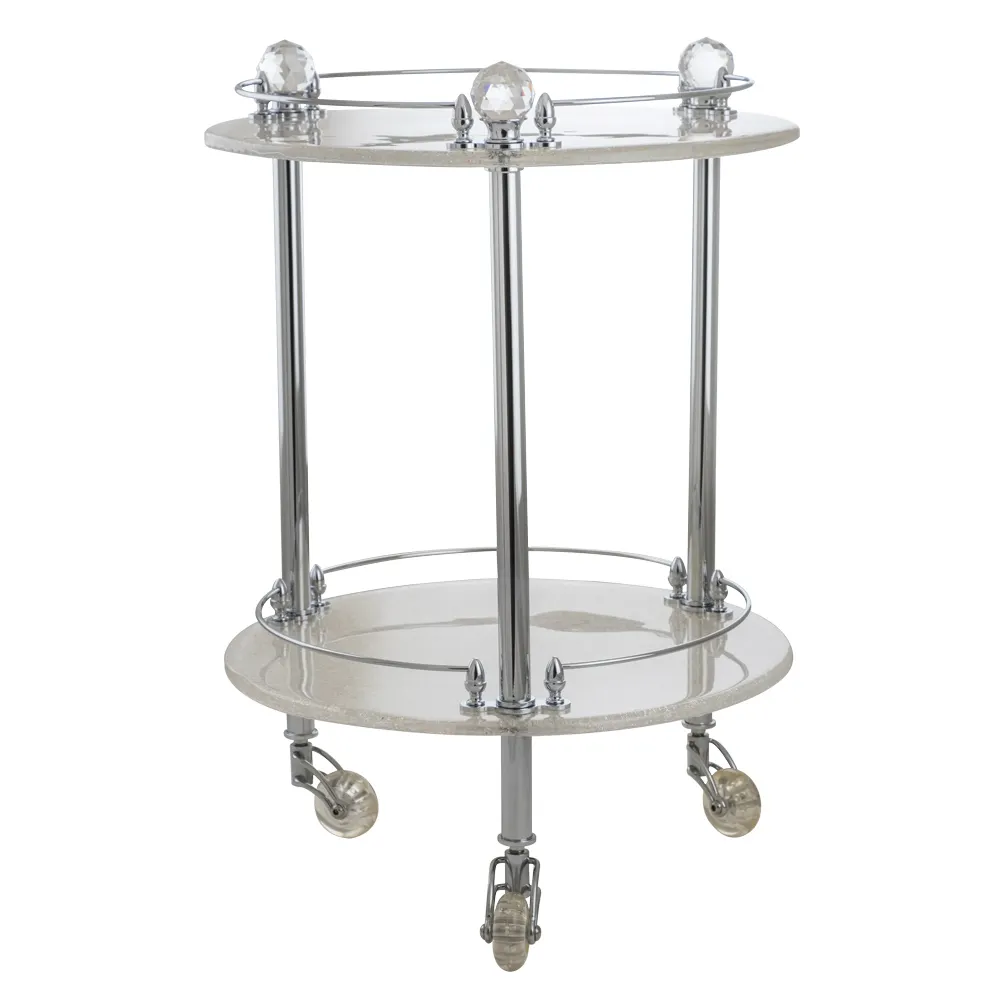 Столик коллекции CRISTALIA бренда MIGLIORE - это красивый и многофункциональный аксессуар, который станет достойным украшением вашего интерьера. Столик на колесах, две круглые полочки выполнены из высококачественного стекла с изящным латунным обрамлением по периметру. Стекло изготовлено вручную с добавлением фольги из серебра, которая, растворяясь в стекле, образует красивый декор. Аксессуар богато украшен кристаллами Сваровски.