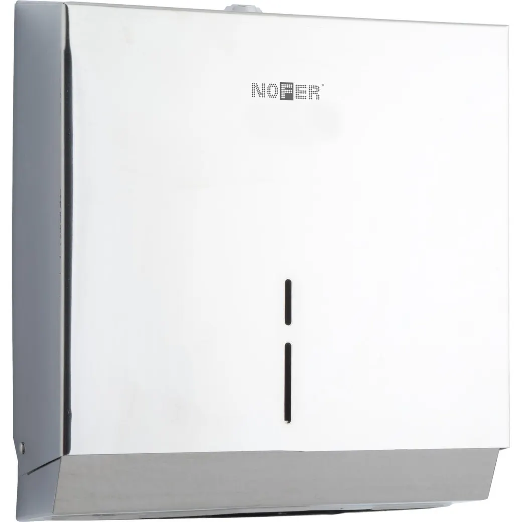 Диспенсер для бумажных полотенец NOFER из нержавеющей стали, переднее отверстие для настенного монтажа. Подходит для полотенец любого типа сложения, с индикатором содержимого и ключом безопасности. Фронтальная загрузка. Глянцевая отделка из нержавеющей стали Размеры: 303 В x 263 Ш x 120 Г (мм).