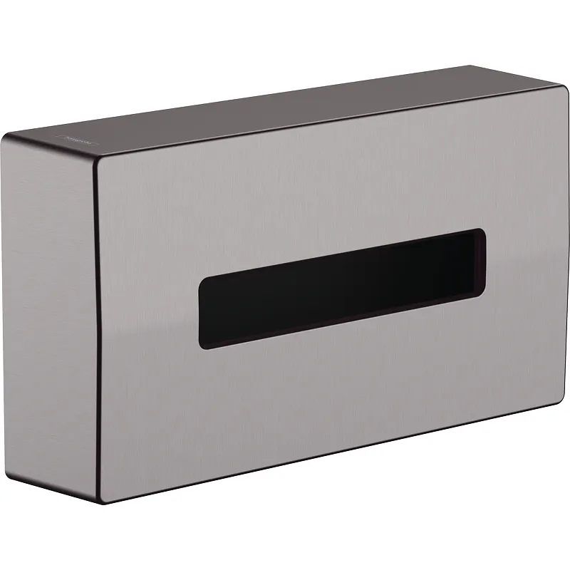 Диспенсер для салфеток Hansgrohe AddStoris 41774340.Характеристики: Цвет: шлифованный черный хром. Материал: пластик. Диаметр между отверстиями: 20 см. Диаметр отверстия: 6 мм. Скрытое крепление. Крышка легко снимается для заполнения емкости. Монтаж: настенный. Крепление клеевое или при помощи шурупов. В комплекте поставки: диспенсер для салфеток.