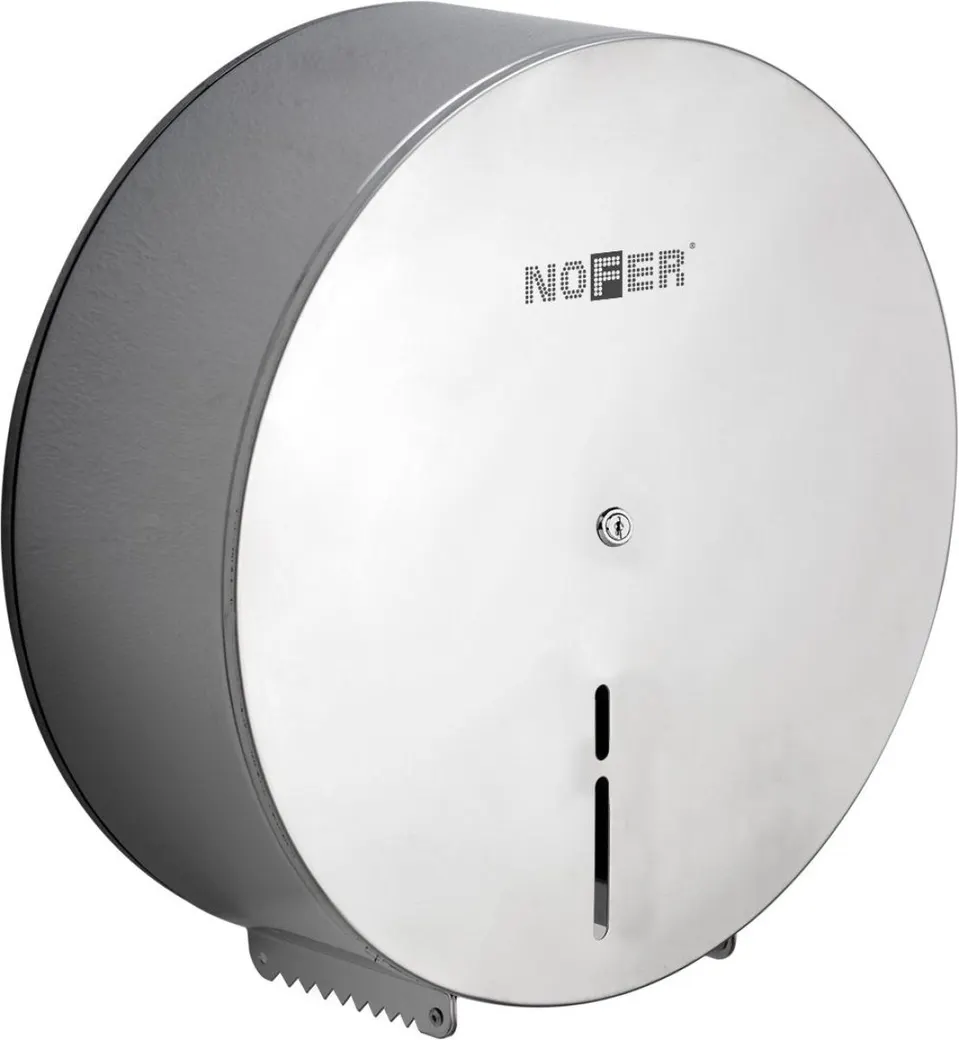 Диспенсер для туалетной бумаги NOFER, нержавеющая сталь, глянцевая отделка, для настенного монтажа. Подходит для промышленного рулона 200 м, с дисплеем содержимого, замком и ключом безопасности. Размеры: 290 В x 285 Ш x 112 Г (мм).