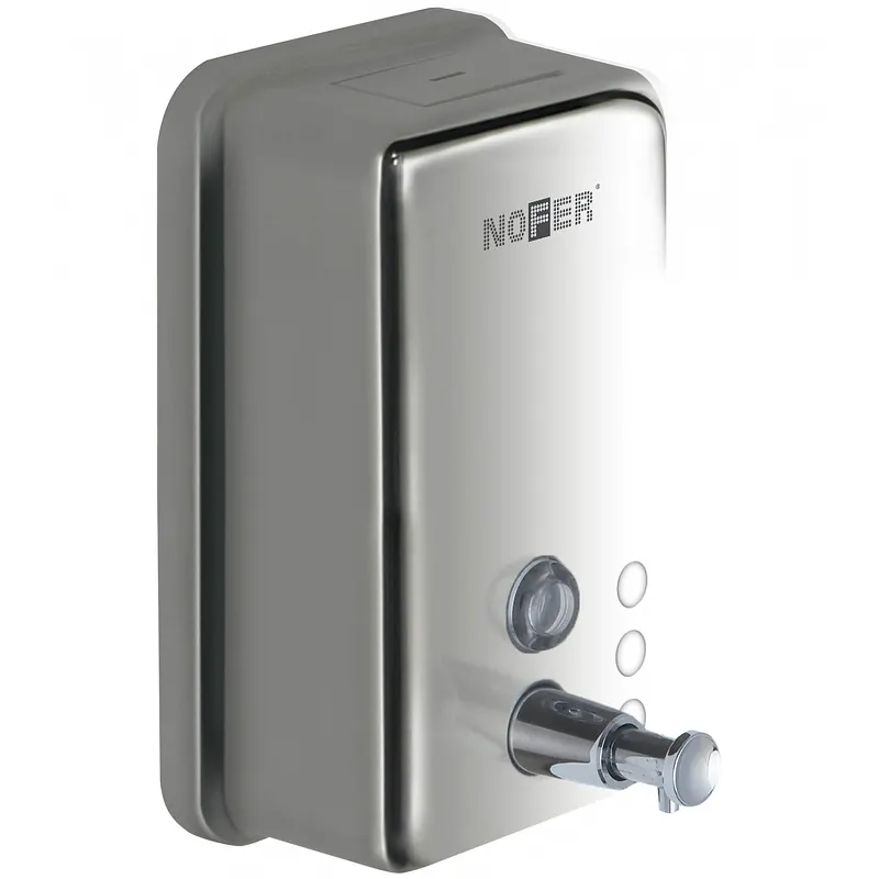 Диспенсер для жидкого мыла Nofer Inox 03041.B настенный.Характеристики:Цвет: глянцевая нержавеющая сталь.Крепление: настенное. Управление нажимное. Корпус из нержавеющей стали AISI 1 мм, внутри пластиковый контейнер. Устойчив к коррозии. Объем: 1.2 л. Размеры: 21 х 12.1 х 7 см. Подходит для всех типов мыла (кроме хирургического). Требует специального ухода очистителем для нержавеющей стали. В комплекте поставки: диспенсер, ключ, комплект креплений.