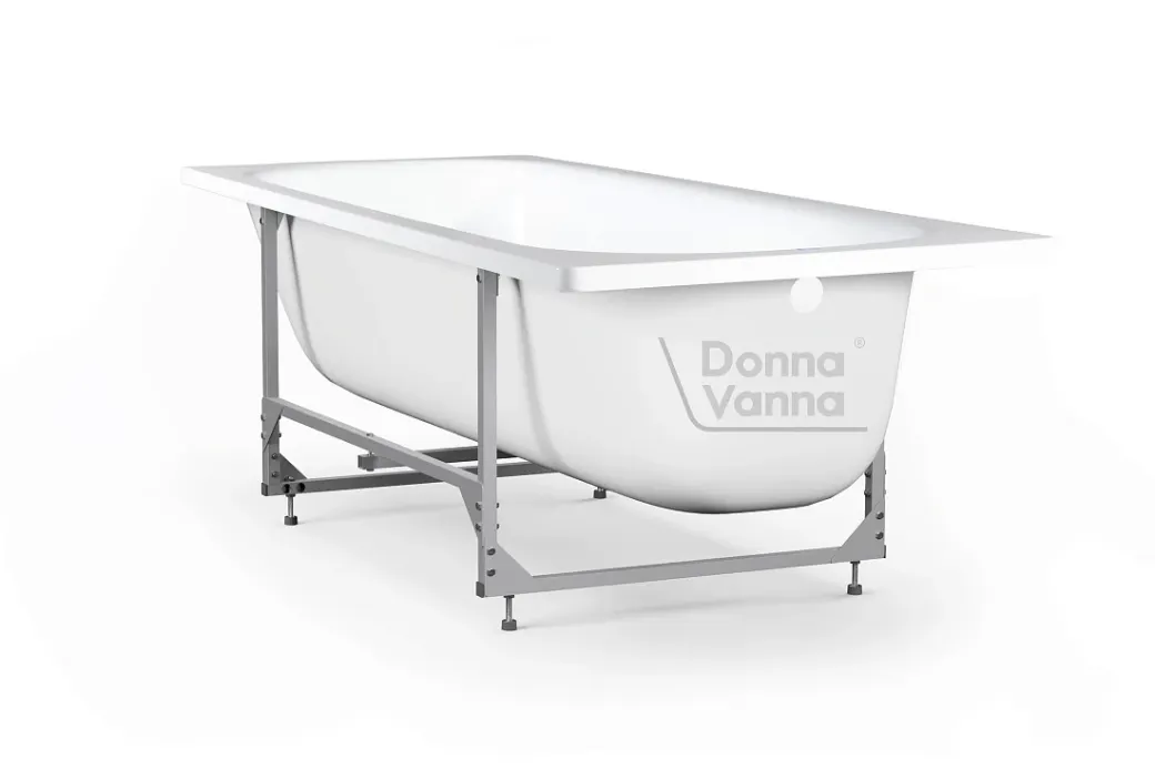 Ванна из стального листа с гладкой стекловидной поверхностью, прямоугольной формы, пристенная, ориентация универсальная. В комплекте с ванной поставляется каркасная подставка из стали.