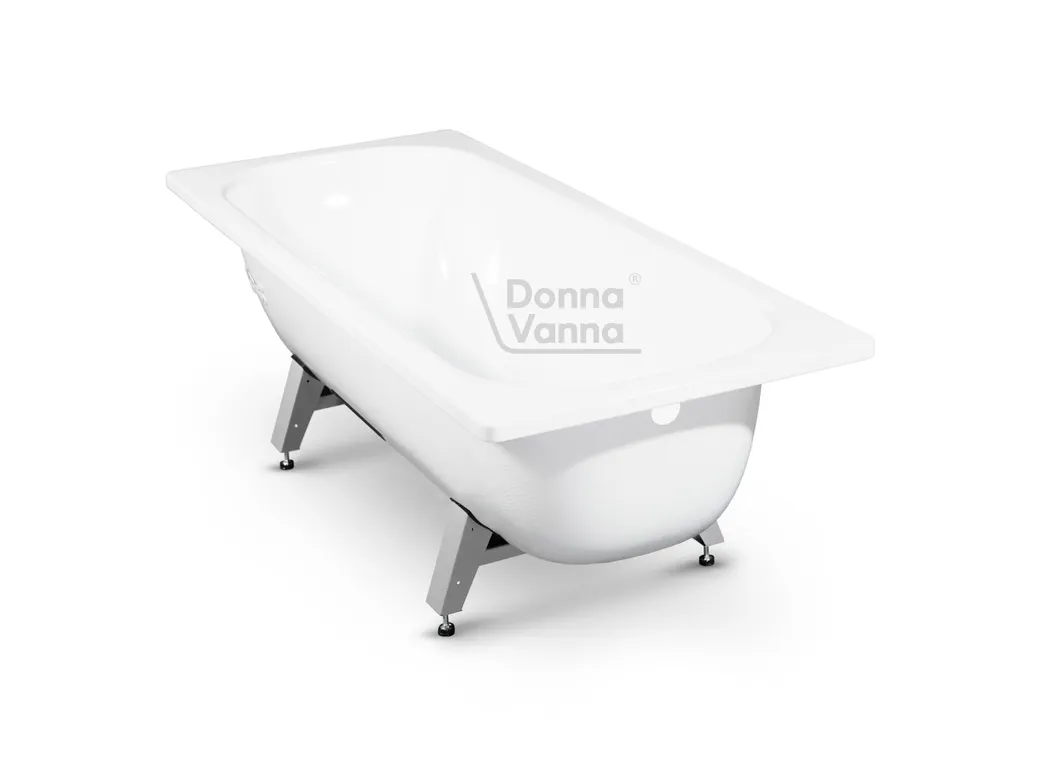 Ванна из стального листа с гладкой стекловидной поверхностью, прямоугольной формы, пристенная, ориентация универсальная. В комплекте с ванной поставляется опорная подставка из стали.