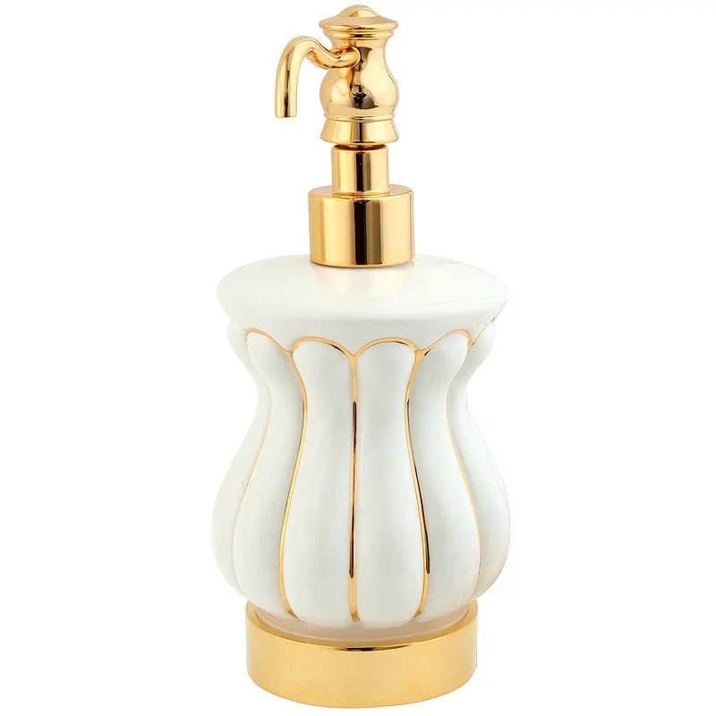Дозатор для жидкого мыла Migliore Olivia 17514 Золото Белый — изысканное дополнение к любой ванной комнате. Изготовленный из прочной латуни с гальваническим покрытием золотом 24 карата, он не только функционален, но и добавляет элегантности. Современный дизайн в стиле ретро идеально вписывается в классические интерьеры. Дозатор настольный, легко устанавливается и удобен в использовании.