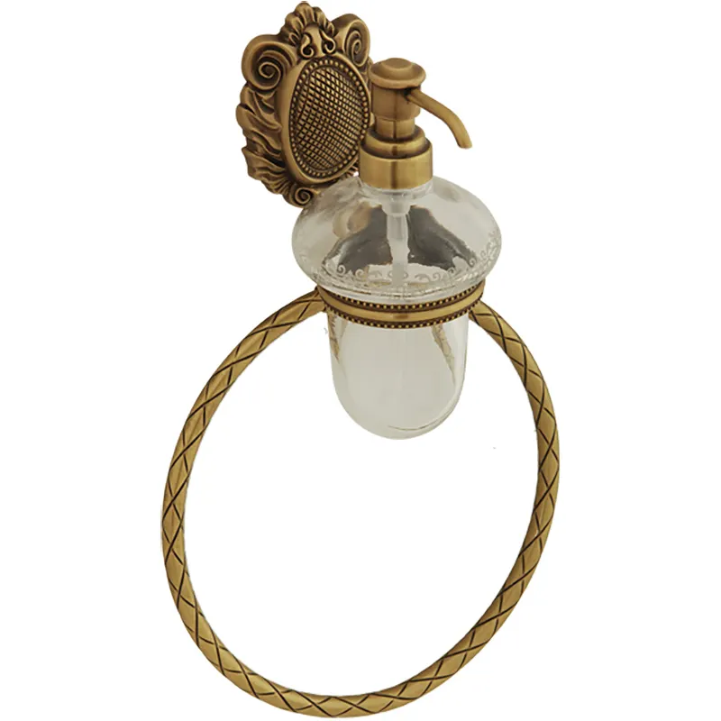 Дозатор для жидкого мыла с кольцом для полотенец Migliore Cleopatra 16627 Бронза станет идеальным дополнением для вашей ванной комнаты. Этот аксессуар, выполненный в дизайне в стиле ретро, изготовлен из высококачественных материалов, таких как латунь и стекло. Настенные монтажные элементы обеспечивают удобство установки и долговечность использования.