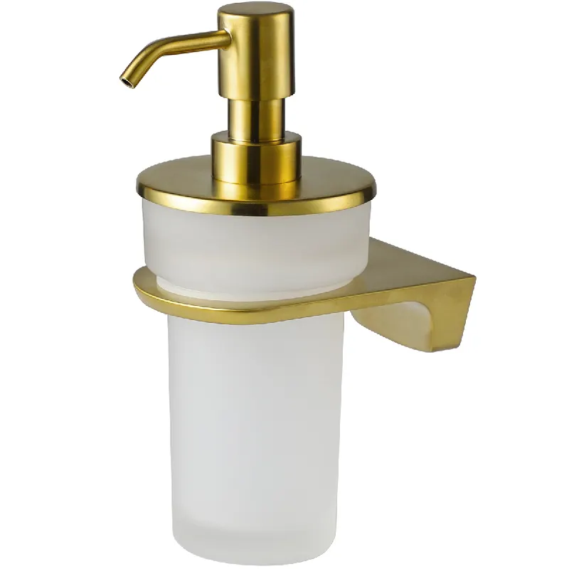 Дозатор для жидкого мыла WasserKRAFT Aisch K-5999.Характеристики: Цвет: золото матовое. Материал: металл, матовое стекло. Уплотнительные пластиковые кольца. Покрытие: PVD. Дозируемое количество: 0,7-1 мл. Монтаж: на стену. В комплекте поставки: Дозатор для жидкого мыла. Комплект креплений.