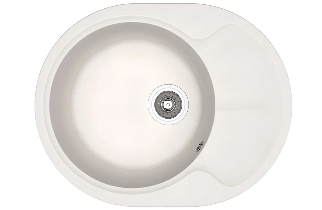 - Прочная круглая мойка: Литьевой мрамор обеспечивает устойчивость к механическим повреждениям, что продлевает срок службы кухонной мойки.