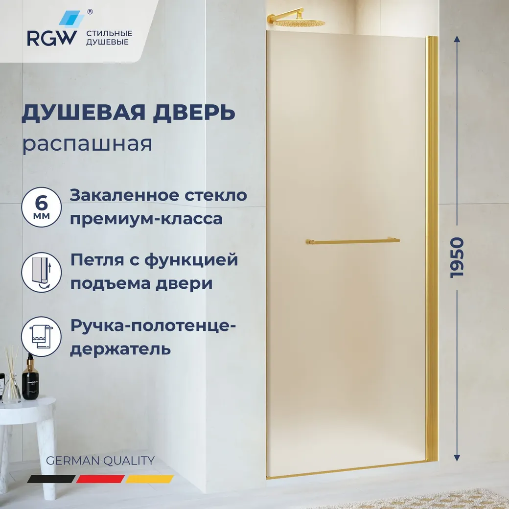 Элегантная душевая дверь RGW PA-103-Gb с распашными дверями и матовым стеклом станет стильным акцентом в вашей ванной комнате. Эта душевая дверь 90x195 см выполнена в цвете золото браш и оснащена высокопрочным закалённым стеклом толщиной 6 мм с покрытием EasyClean, что облегчает уход за поверхностью.
