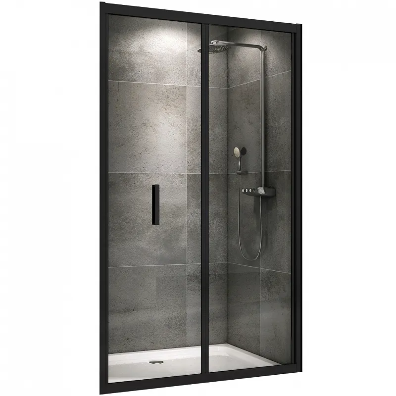 - Душевая дверь с черным профилем и прозрачным стеклом.