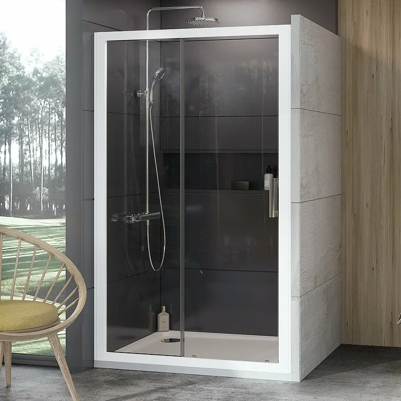 - Душевая дверь с белым алюминиевым профилем и прозрачным стеклом.