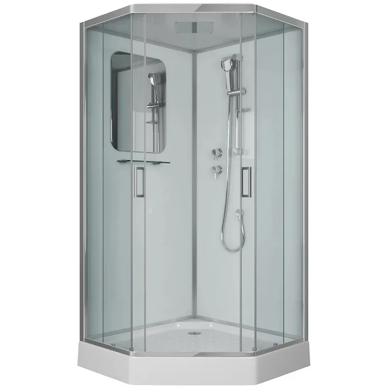 - Полный комплект: Встроенное зеркало, полочка и тропический душ делают использование кабины более удобным.