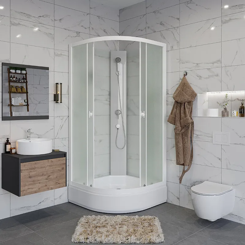 - Эффективное использование пространства: форма четверть круга и раздвижные двери обеспечивают компактность и легкий доступ.