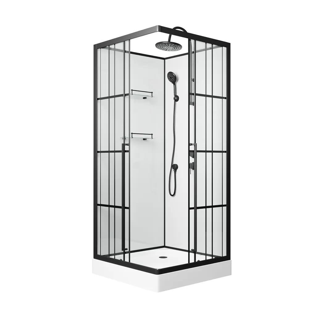Душевая кабина Niagara Standart ST90/15QR/KL/BKT (900х900х2250) без крыши. Форма квадратная. Двери раздвижные. Высота с учетом тропического душа 225 см. Внутренняя высота 193 см. Правое расположение, (задние стенки и двери не взаимозаменяемы). Профиль алюминиевый черный матовый. Остекление: закаленное стекло. Лицевые стела прозрачные 5 мм с рисунком клетка. Задние стенки белые крашенные 4 мм. Поддон низкий (15 см, глубина 2-4 см) усиленный, выдерживает нагрузку до 350 кг. Слив в углу, диаметр 5 см. Бессиликоновая сборка за счет дренажных каналов и бортиков. Вода не скапливается, что исключает образование плесени и грибков.