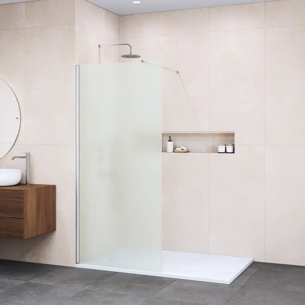 - Эстетика и освещение: Матовая поверхность стекла сохраняет приватность, при этом не препятствует проникновению света, что делает ванную комнату более светлой и просторной.