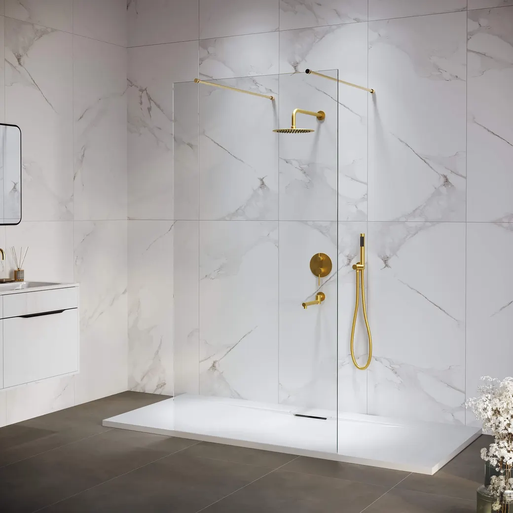 - Эстетичный дизайн: Прозрачное стекло и золотой профиль идеально вписываются в любой интерьер.