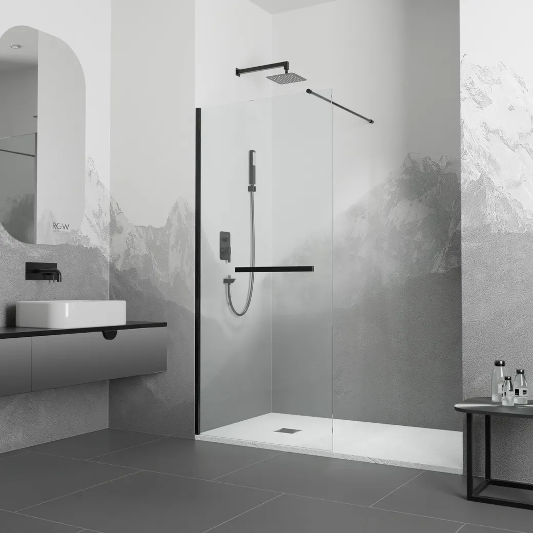 - Современный дизайн: Черный профиль гармонично сочетается с прозрачным стеклом, подчеркивая стиль и минимализм вашей ванной комнаты.
