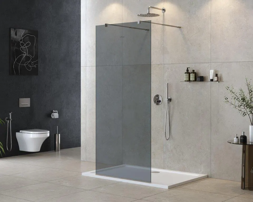 Перегородка выполнена из прочного закаленного стекла, что гарантирует её безопасность в использовании. Стеклянная конструкция придает лёгкость и визуально увеличивает пространство ванной комнаты. Изделие доступно в актуальном сером цвете, гармонично вписывающемся в современные интерьеры.