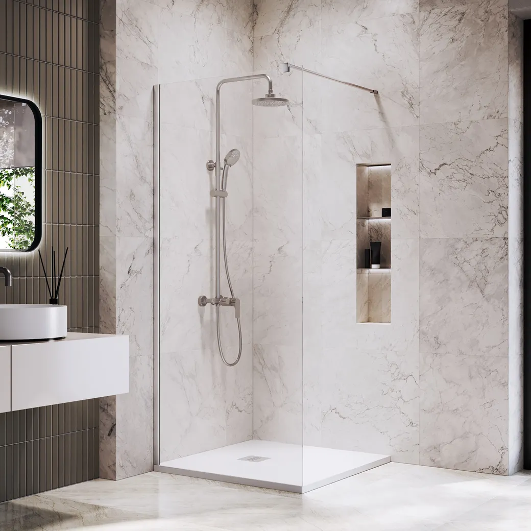 - Прозрачное стекло 6 мм: Обеспечивает прочность и визуальную легкость, что придаёт ванной комнате просторный вид.