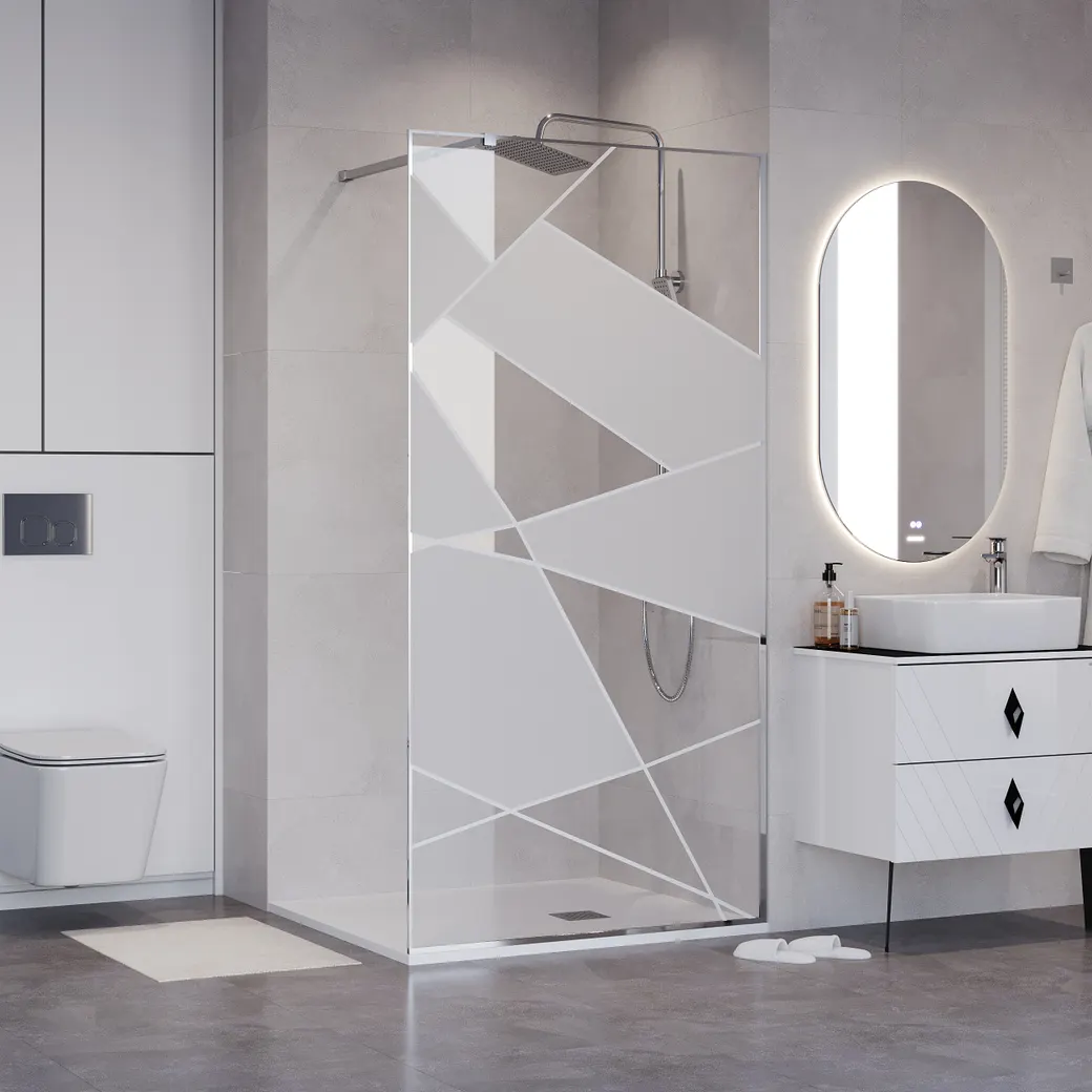 Душевая перегородка Niagara Nova NG-660-90 (90*195) - это стильное и современное душевое ограждение с хромированным профилем по всему периметру, которое добавит изысканности и элегантности вашей ванной комнате. изготовленая из закаленного стекла с рисунком толщиной 8 мм, что соответствует стандарту EN 12150-1:2000 и гарантирует ее высокое качество и надежность. Телескопическая штанга с регулировкой от 700 до 1200 мм позволяет легко адаптировать душевую перегородку к различным размерам душевого пространства, обеспечивая идеальную посадку и плотное прилегание к стенам. Хромированный профиль и рисунок на стекле придает ограждению современный и стильный вид, который гармонично впишется в любой дизайн ванной комнаты. Стекло имеет белые полосы и чередующиеся прозрачные и матовые геометрические элементы. Эта душевая перегородка не только обеспечит вам комфорт и удобство во время приема душа, но и станет элегантным украшением вашего ванного пространства.
