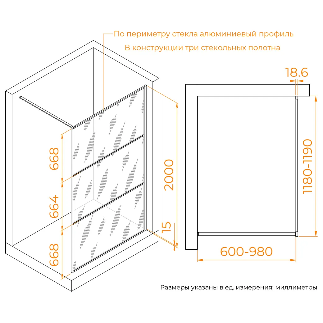 Главное преимущество данной модели — минимальная упаковка в виде чемоданчика с ручкой. Это позволяет легко и удобно транспортировать душевую перегородку! Душевая перегородка состоит из 3-х стекольных полотен (8мм), которые обрамлены изящным анодированным алюминиевым профилем! Штанга из стали S304, крепится к стене, она обеспечивает стабильность душевого ограждения. Длина стальной штанги 1000 мм, при этом ее всегда можно укоротить путем обычной подрезки. В конструктив модели возможно добавить тканевую водонепроницаемую шторку, при этом варианте использовать Штангу - кронштейна как карниз. Модели представлены в трендовых цветовых решениях профиля: