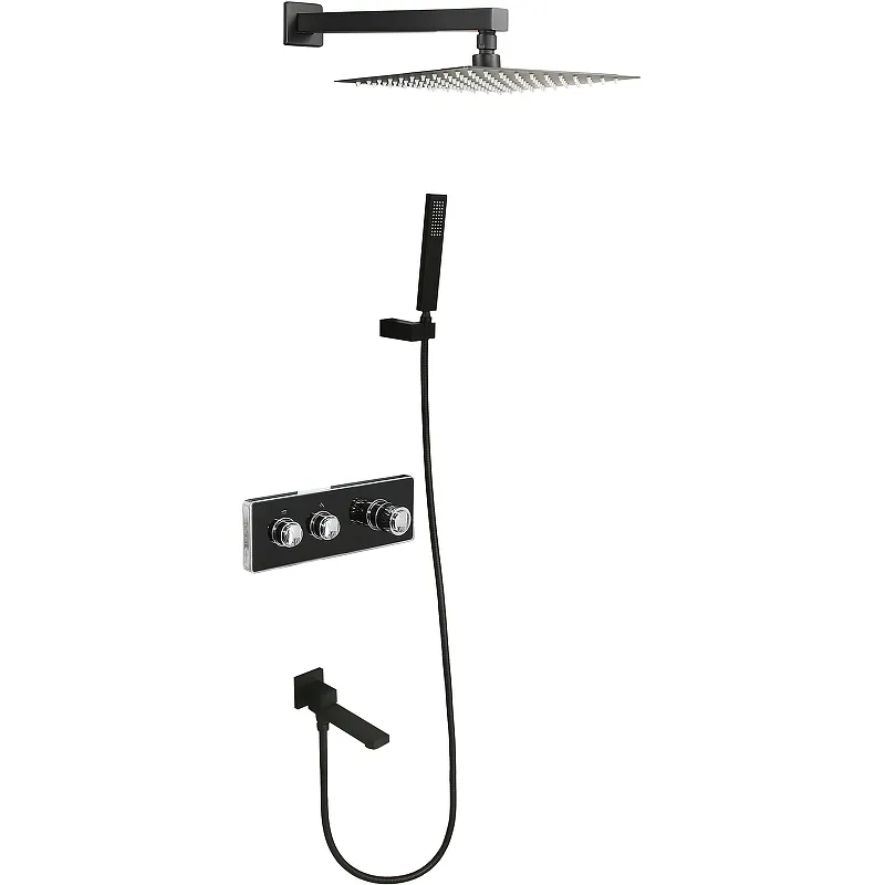 Душевая система ALMAes Olef TVZ-0898 с термостатом - идеальное решение для вашей ванной комнаты. Черная матовая душевая система выполнена в современном стиле и предназначена для установки в ванну и душ. Сочетание латунного смесителя и нержавеющей стали обеспечивает долговечность и надежность. Встраиваемая в стену конструкция позволяет экономить пространство, а цифровой цветной дисплей делает управление простым и удобным.