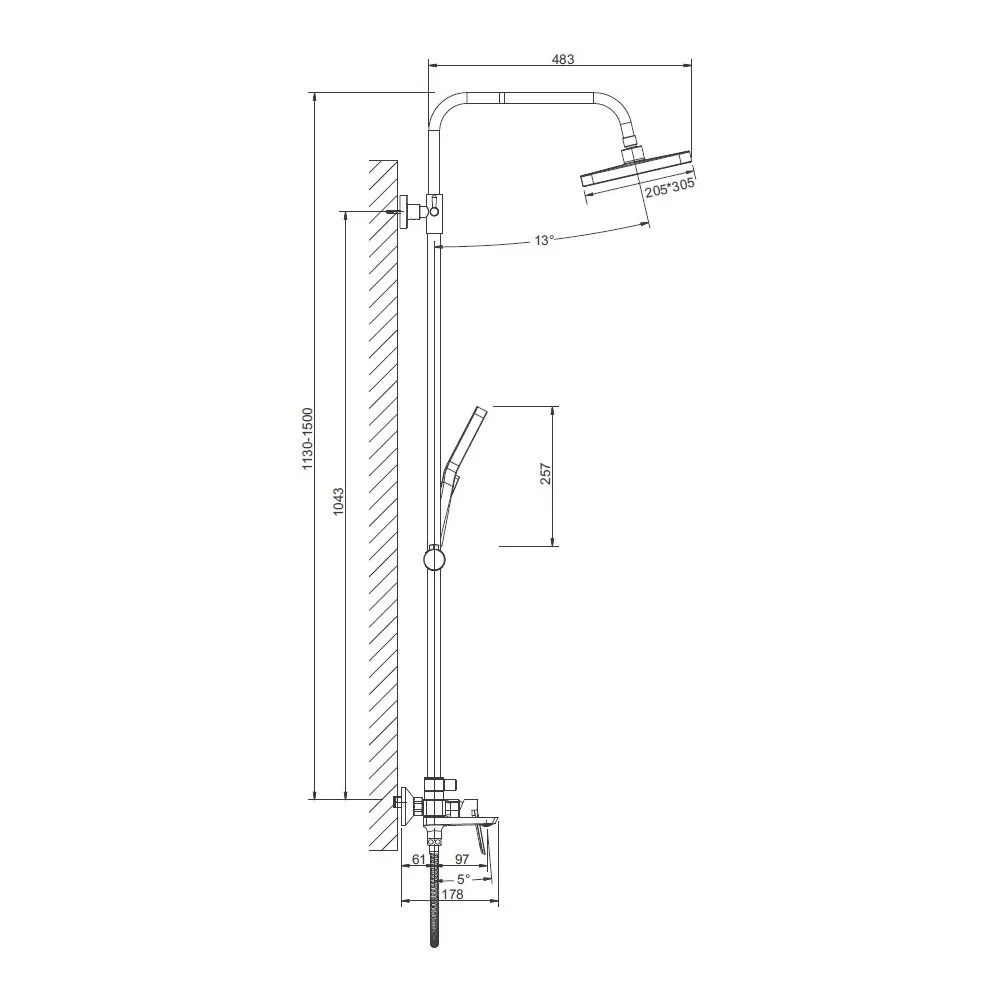 Излив душевой системы оснащён аэратором и в сложенном состоянии служит переключателем потока воды, что добавляет удобства в использовании. Верхний душ размером 305х205 мм изготовлен из ABS-пластика и оснащён силиконовыми форсунками, которые легко очищаются от известкового налёта. Благодаря шарниру верхний душ можно регулировать по наклону вдоль всей оси, а его высота настраивается с помощью телескопической конструкции штанги.