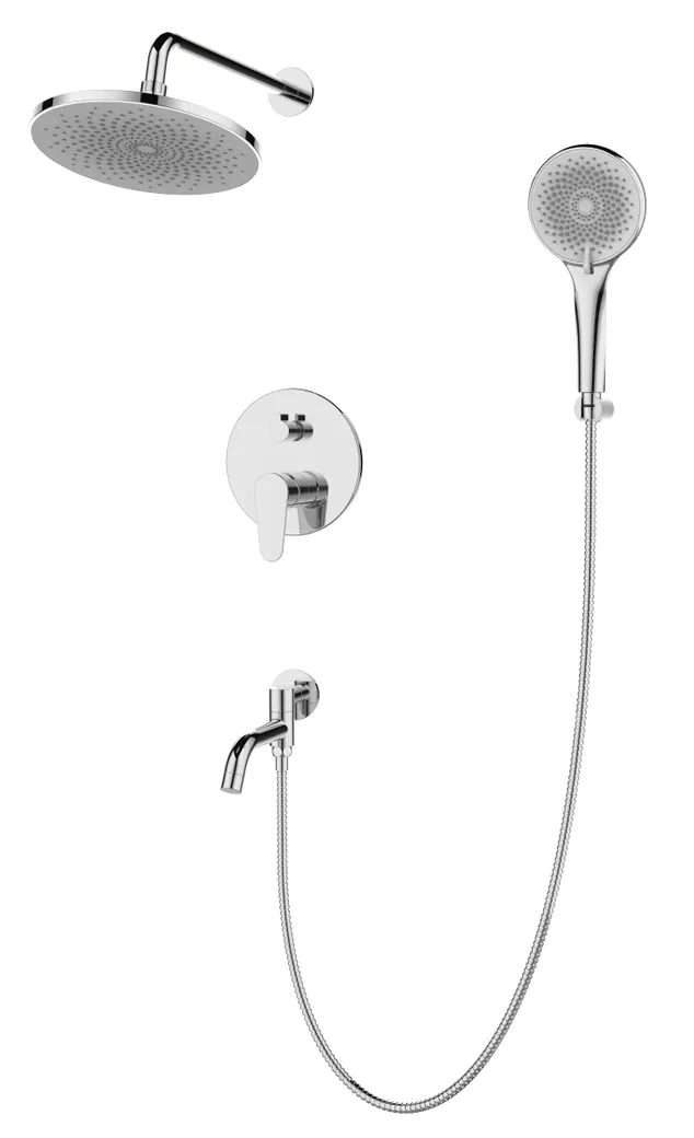 Душевая система скрытого монтажа со смесителем и изливом. Диаметр верхнего душа 225мм. Ручной душ диаметром 125мм. Механический дивертор.