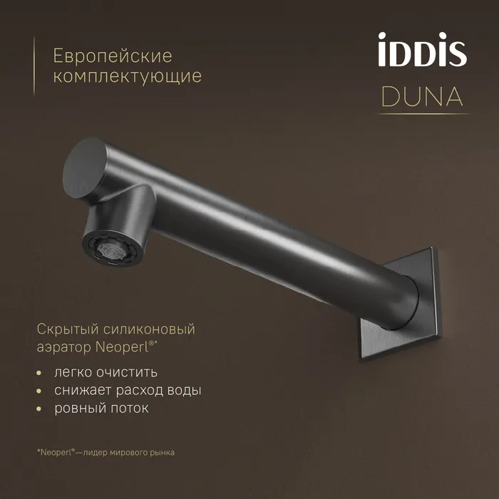 Скрытый аэратор Neoperl® (Испания) не нарушает дизайн, формирует ровный поток и снижает расход воды. Ключ для обслуживания в комплекте.