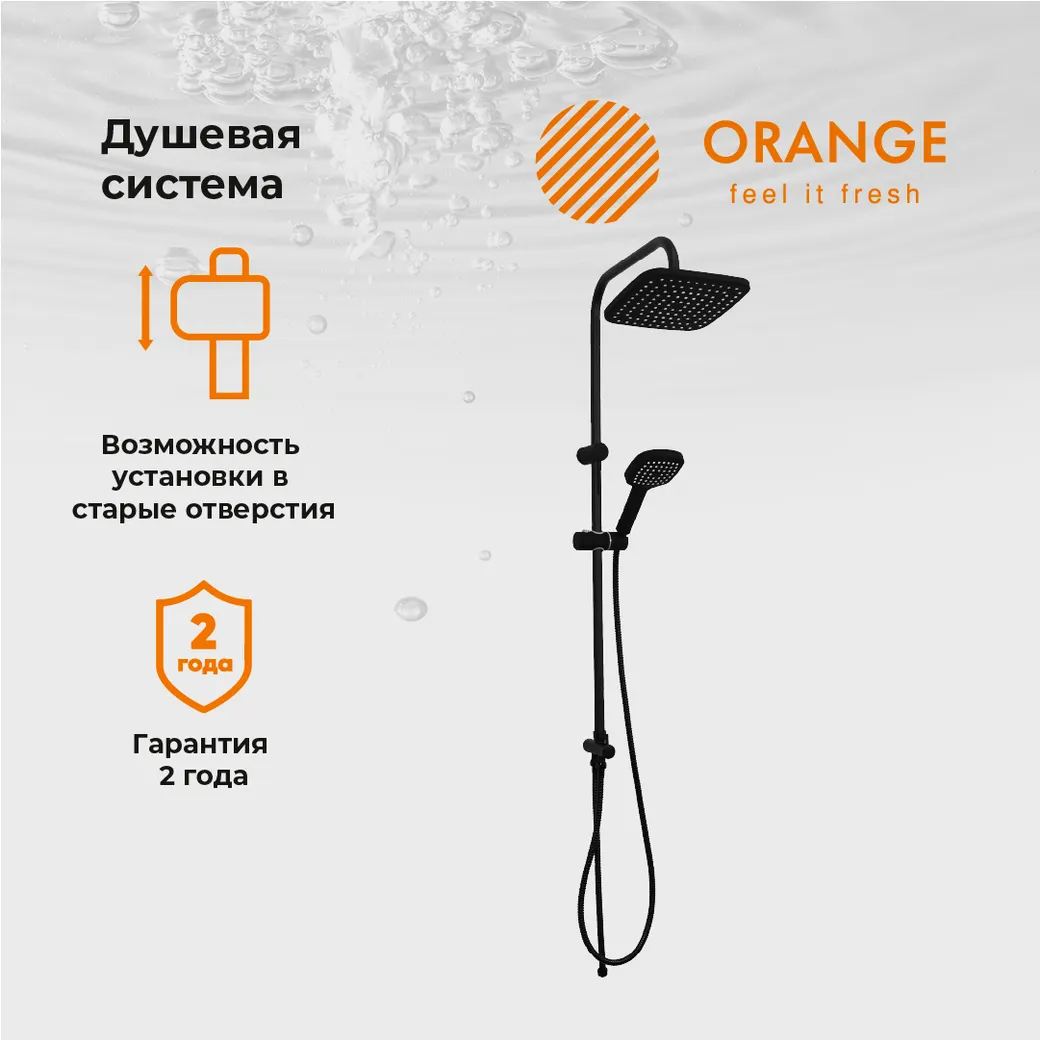 Душевая система Orange O-Shower в цвете черный матовый: верхний душ (230х230 мм) создаёт эффект тропического дождя, что дарит непередаваемые эмоции во время ежедневных банных процедур. Ручной душ 120 мм (1 режим) на гибком полутораметровом шланге (в металлической оплетке) с защитой от перекручивания. Держатели верхнего и ручного душа с регулировкой угла наклона, штанга 970 мм с подвижным держателем (возможность установки в старые отверстия). Подвижные детали отличаются долговечностью. Форсунки верхнего и ручного душа с функцией легкого очищения от известкового налета.