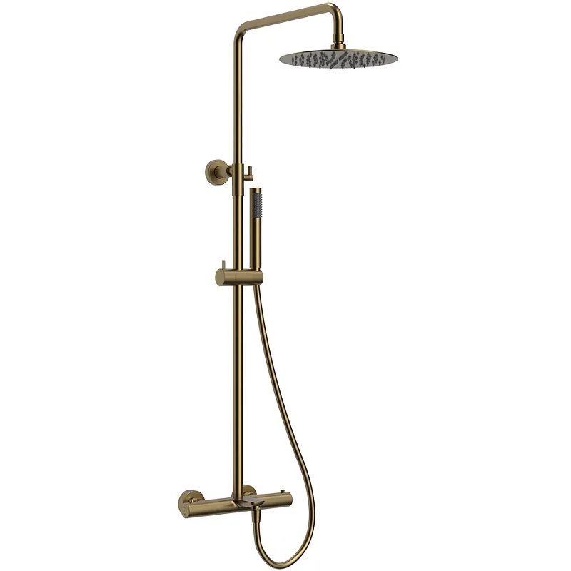 - Элегантный дизайн в золотом матовом цвете: украсьте свою ванную роскошной душевой системой.