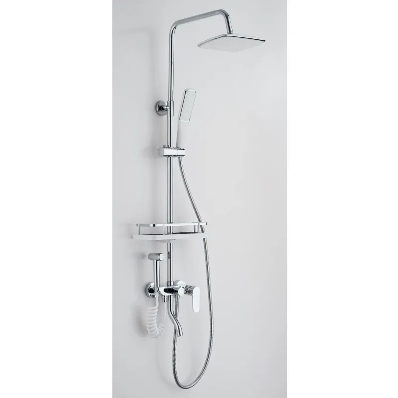 Душевая система Сантаком с гигиеническим душем. Производство: Россия. Изготовлена из высококачественной латуни. Прекрасный тропический душ. Излив для наполнения ванны. Душевая штанга регулируется по высоте от 80 см до 110 см.