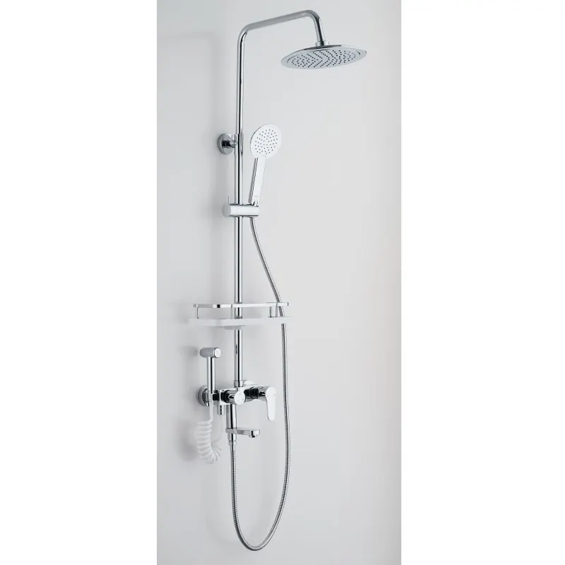 Душевая система Сантаком с гигиеническим душем. Производство: Россия. Изготовлена из высококачественной латуни. Прекрасный тропический душ. Излив для наполнения ванны. Душевая штанга регулируется по высоте от 80 см до 110 см.