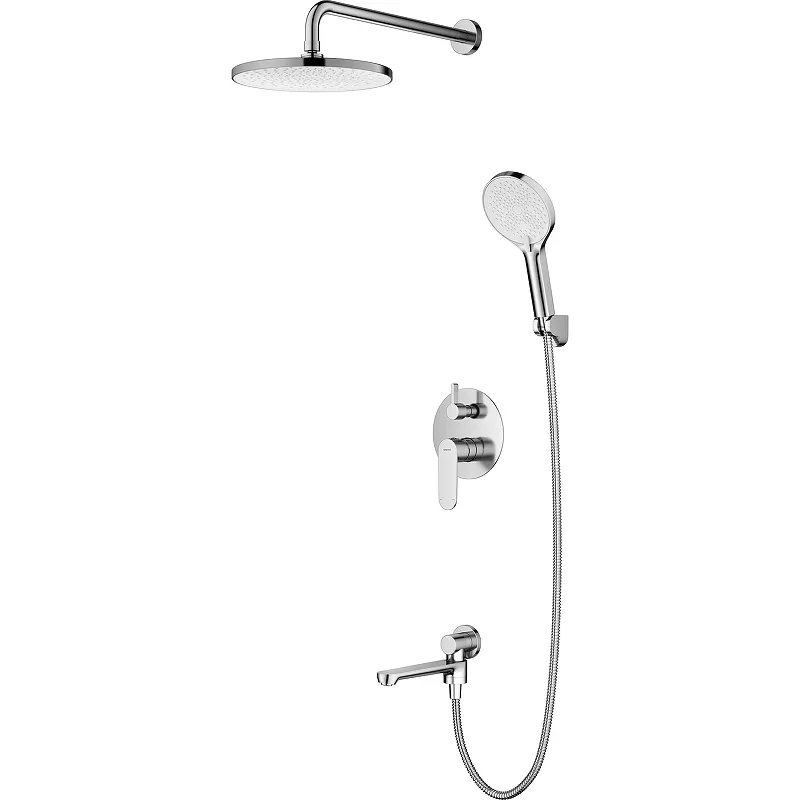 - Комплексное решение: В комплект входит смеситель для душа, верхний душ, излив и другие элементы, что позволяет сразу приступить к установке.
